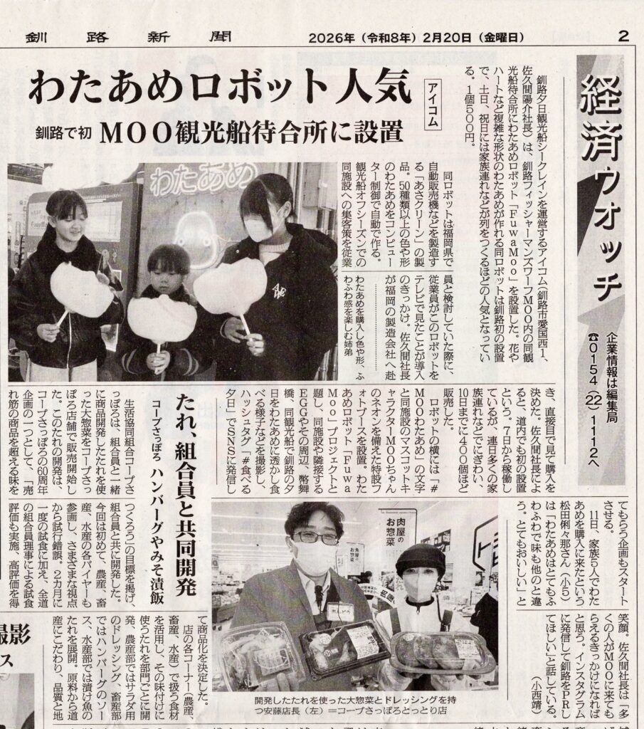 釧路新聞に、釧路フィッシャーマンズワーフ MOOさんのわたあめロボットが大きく記事で取り上げられました!